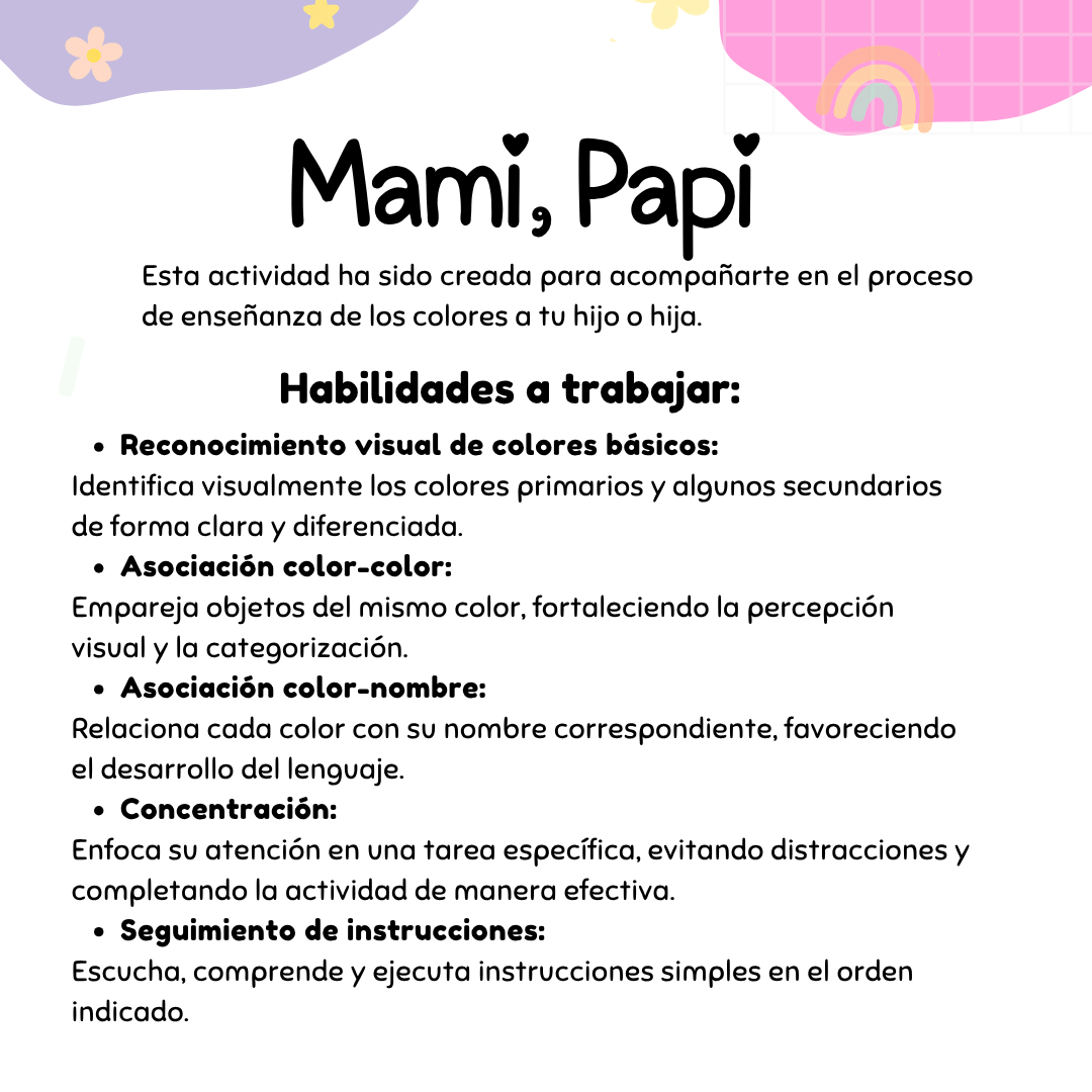 Esta actividad ha sido creada para acompañarte en el proceso de enseñanza de los colores a tu hijo o hija, fortaleciendo habilidades clave a través del juego y la exploración visual.