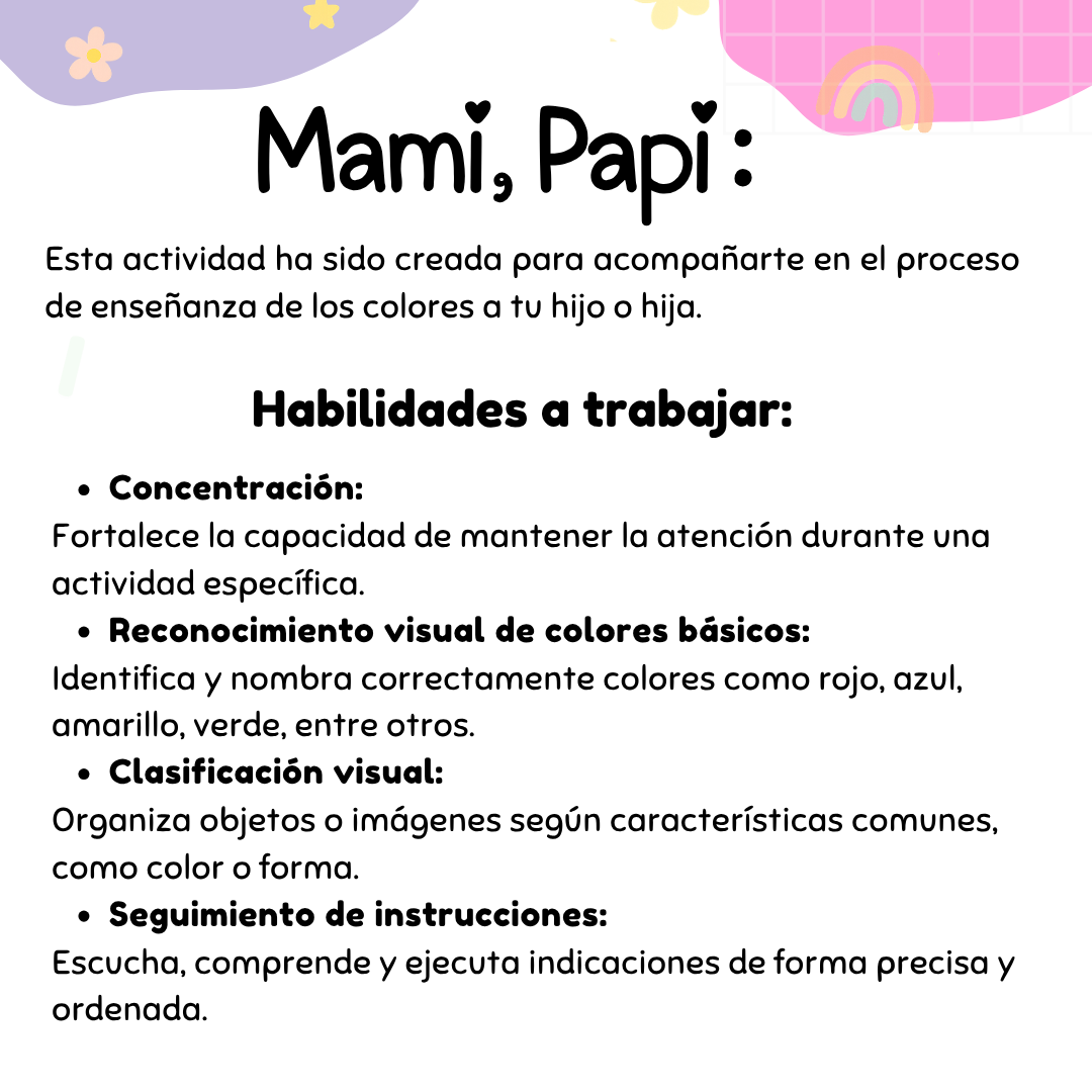 Esta actividad ha sido creada para acompañarte en el proceso de enseñanza de los colores a tu hijo o hija, promoviendo el desarrollo de habilidades clave a través del juego y la observación.